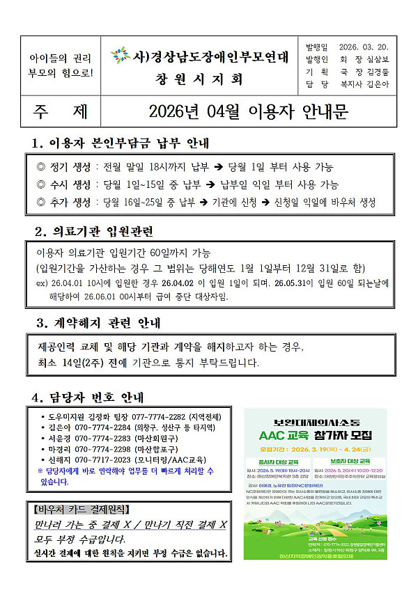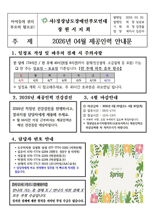 2026년 4월 이용자 및 제공인력 안내문 페이지 정보 작성자 창원시지회 작성일26-04-02 17:31 조회16회 댓글0건 본문 2026년 4월 이용자 및 제공인력 안내문 댓글목록 등록된 댓글이 없습니다. 다음글 목록