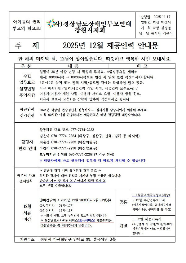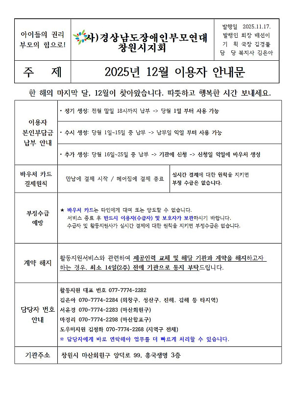 2025년 12월 이용자 및 제공인력 안내문 페이지 정보 작성자 창원시지회 작성일25-12-04 13:22 조회2회 댓글0건 본문 2025년 12월 이용자 및 제공인력 안내문 댓글목록 등록된 댓글이 없습니다. 다음글 목록