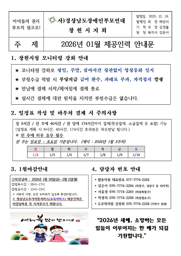 2026년 1월 이용자 및 제공인력 안내문 페이지 정보 작성자 창원시지회 작성일26-01-02 10:09 조회51회 댓글0건 본문 2026년 1월 이용자 및 제공인력 안내문 댓글목록 등록된 댓글이 없습니다. 이전글 다음글 목록