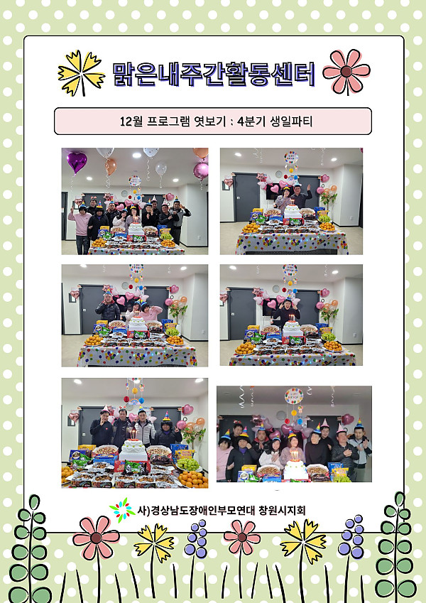 맑은내주간활동센터 12월 프로그램 엿보기 페이지 정보 작성자 창원시지회 작성일25-12-31 12:38 조회73회 본문 맑은내주간활동센터 12월 프로그램 엿보기 ② 댓글목록 등록된 댓글이 없습니다. 다음글 목록