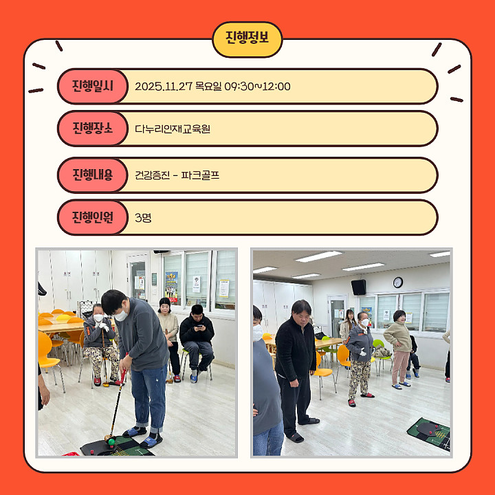 성인남성 역량강화 프로그램 36회 페이지 정보 작성자 창원시지회 작성일25-11-27 15:42 조회29회 댓글0건 본문 성인남성 역량강화 프로그램 36회 진행하였습니다.진행 일시: 2025. 11. 27(목) 09:30~13:00진행 장소: 다누리인재교육원진행 내용: 건강증진 - 파크골프진행 인원: 3명 댓글목록 등록된 댓글이 없습니다. 이전글 다음글 목록