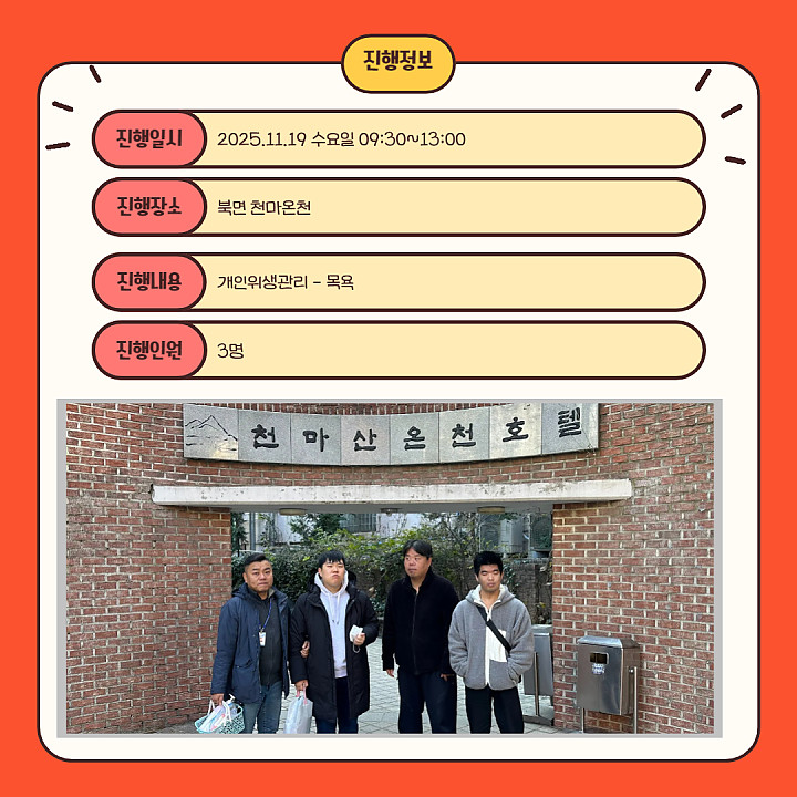 성인남성 역량강화 프로그램 35회 페이지 정보 작성자 창원시지회 작성일25-11-19 15:17 조회15회 댓글0건 본문 성인남성 역량강화 프로그램 35회 진행하였습니다.진행 일시 : 2025.11.19(수) 09:30~13:00진행 장소 : 북면 천마온천진행 내용 : 개인위생관리 - 목욕진행 인원 : 3명 댓글목록 등록된 댓글이 없습니다. 이전글 다음글 목록