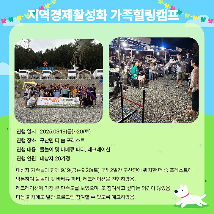 대상자 가족들과 함께 9.19(금)~9.20(토) 1박 2일간 구산면에 위치한 더 숨 포레스트에 방문하여 물놀이 및 바베큐 파티, 레크레이션을 진행하였음.