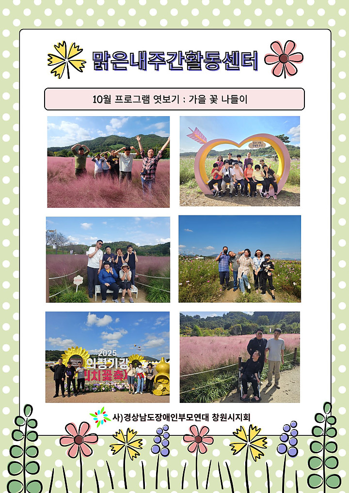 맑은내주간활동센터 10월 프로그램 엿보기 페이지 정보 작성자 창원시지회 작성일25-10-15 12:52 조회30회 댓글0건 본문 맑은내주간활동센터 10월 프로그램 엿보기 ① 댓글목록 등록된 댓글이 없습니다. 이전글 다음글 목록