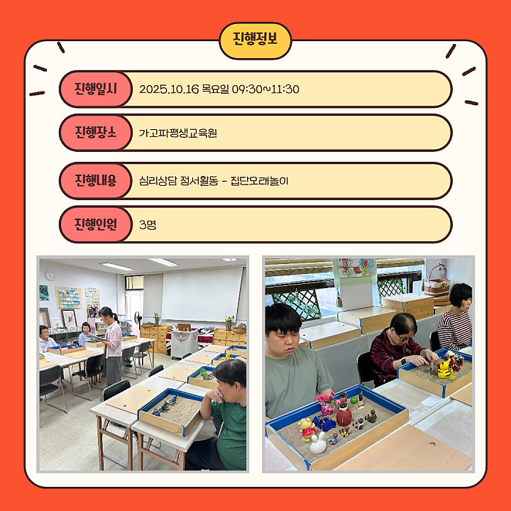 성인남성 역량강화 프로그램 30회 페이지 정보 작성자 창원시지회 작성일25-10-16 13:19 조회22회 댓글0건 본문 성인남성 역량강화 프로그램 30회 진행하였습니다.진행 일시 : 2025.10.16(목) 09:30~11:30진행 장소 : 가고파평생교육원진행 내용 : 심리상담 정서활동 - 집단모래놀이진행 인원 : 3명 댓글목록 등록된 댓글이 없습니다. 이전글 다음글 목록