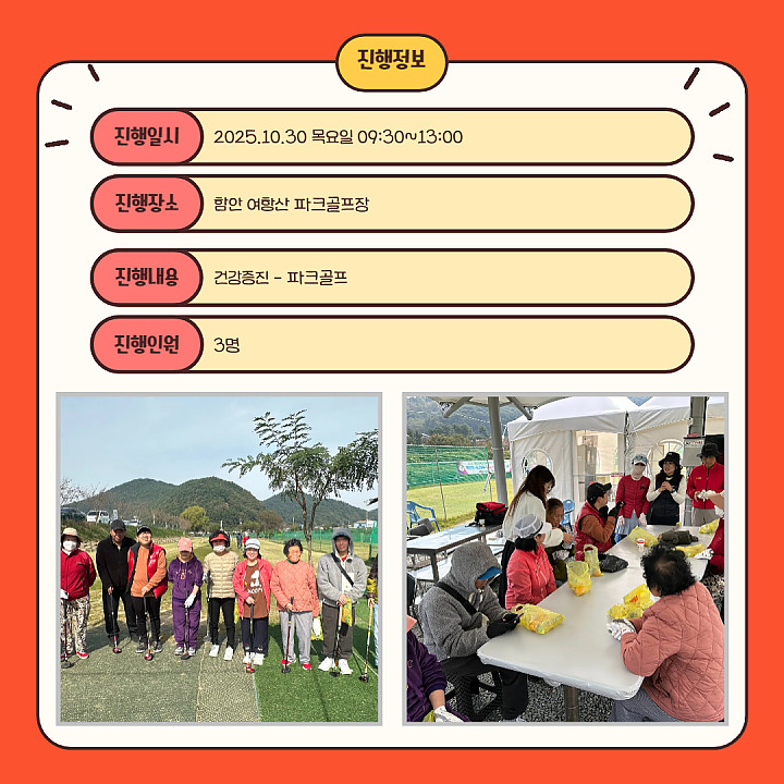 성인남성 역량강화 프로그램 32회 페이지 정보 작성자 창원시지회 작성일25-10-30 18:33 조회33회 댓글0건 본문 성인남성 역량강화 프로그램 32회 진행하였습니다.진행 일시 : 2025.10.30(목) 09:30 ~ 13:00진행 장소 : 함안 여항산 파크골프장진행 내용 : 건강증진 - 파크골프진행 인원 : 3명 댓글목록 등록된 댓글이 없습니다. 이전글 다음글 목록