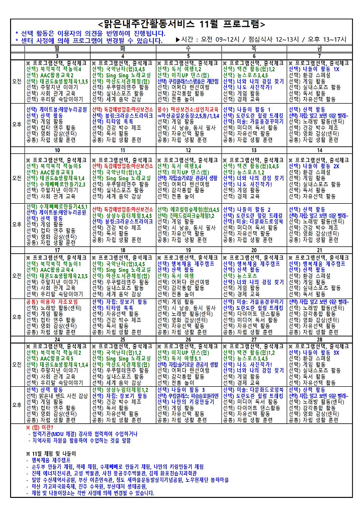 맑은내주간활동센터 11월 프로그램 페이지 정보 작성자 창원시지회 작성일25-11-03 15:20 조회26회 댓글0건 본문 ▶맑은내주간활동센터 11월 프로그램 댓글목록 등록된 댓글이 없습니다. 이전글 다음글 목록