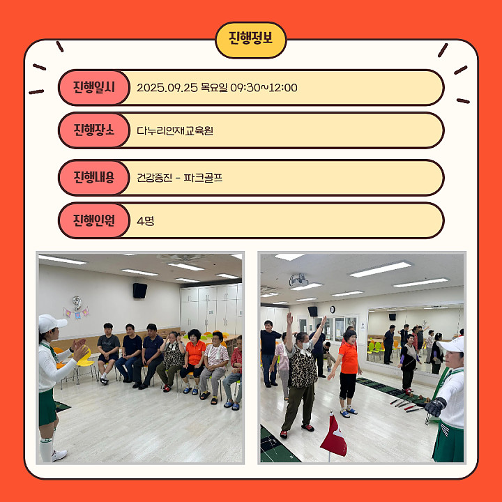 성인남성 역량강화 프로그램 28회 페이지 정보 작성자 창원시지회 작성일25-09-25 17:26 조회37회 댓글0건 본문 성인남성 역량강화 프로그램 28회 진행하였습니다.진행 일시 : 2025.09.25(목) 09:30~12:00진행 장소 : 다누리인재교육원진행 내용 : 건강증진 - 파크골프진행 인원 : 4명 댓글목록 등록된 댓글이 없습니다. 이전글 다음글 목록